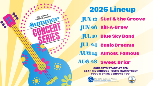 Concerts begin at 7:00 p.m. at the Star Riverhouse, 960 South Main Street, with food and drink vendors available. 2026 performers include Stef & the Groove (June 12), Kill-A-Brew (June 26), Blue Sky Band (July 10), Casio Dreams (July 24), Almost Famous (August 14), and Sweet Briar (August 28).